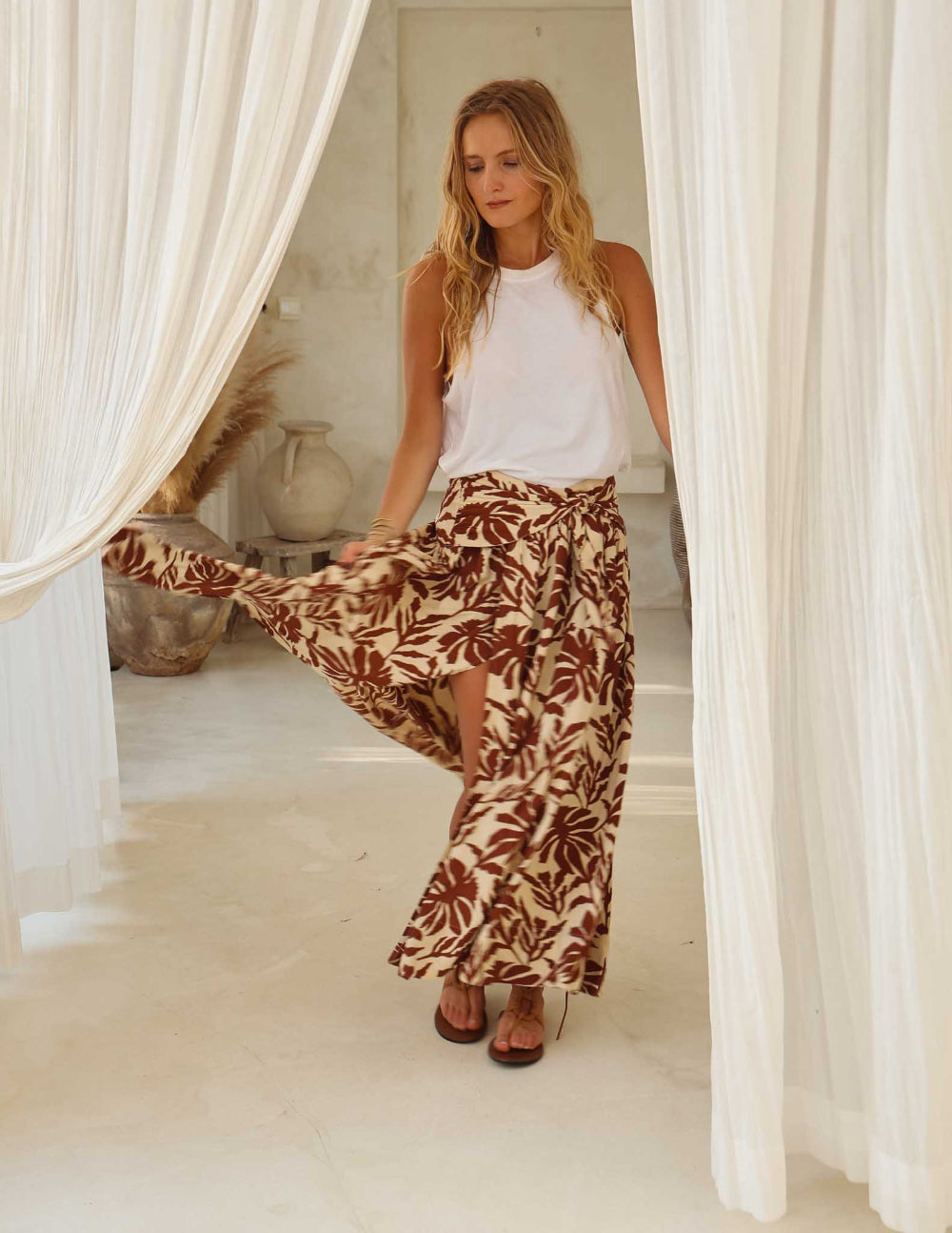 La pollera Camille es larga y con volumen, con una abertura que se marca al caminar y un lazo ajustable en la cintura. Es lo más cómoda que hay y levanta cualquier tenida. Fue el HIT del año pasado y este año vuelve en dos tallas: S/M y M/L.